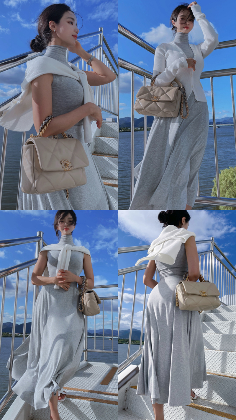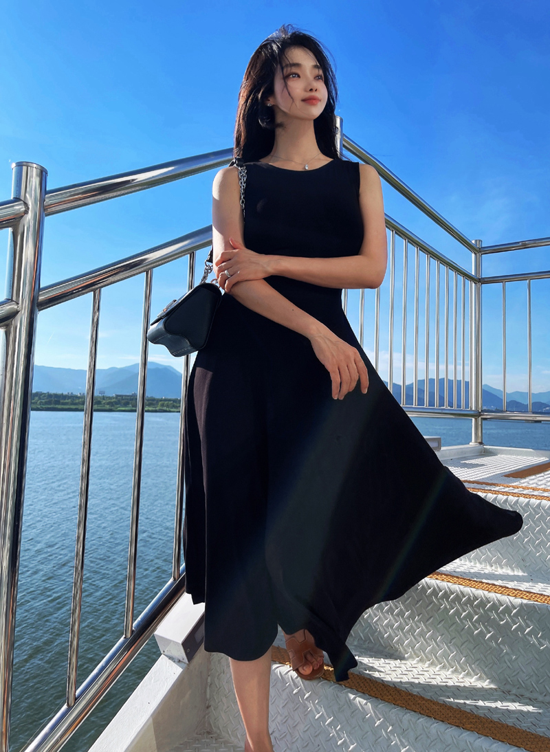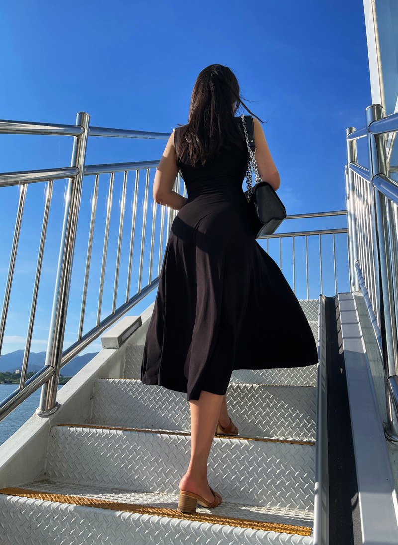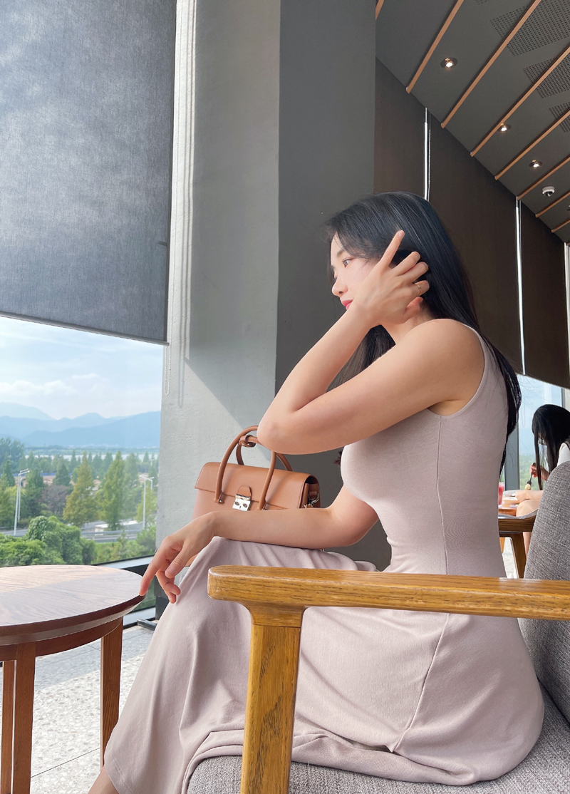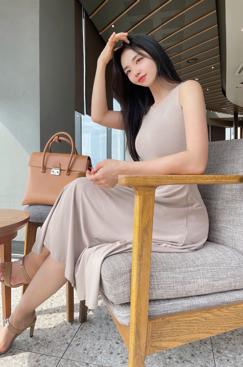 종아리 중간 아래의 기장감으로 앵클부츠와 가장 예쁘게 매치되는 기장감이며, 그에 맞게 스커트 품도 맥시원피스 끝단보다 더 슬림하게 떨어집니다. 가장 여성스러운 라인의 유넥이며, 속옷 노출 안되도록 파임이 과하게 깊어지지 않으면서 쇄골과 어깨라인은 예쁘게 드러나는 예쁘게 시원스러운 스퀘어 유넥 입니다.